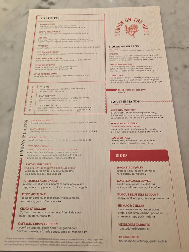 Located on Gillham Rd in Kansas City, Missouri, Union On The Hill offers a unique dining experience with a focus on New American and seafood cuisine. This black-owned and women-owned establishment provides a variety of amenities such as outdoor seating, free Wi-Fi, and a full bar, making it perfect for any occasion. The menu features delectable starters like Artichoke Tempura and a Charcuterie Board, as well as fresh salads like Beets & Whipped Goat Cheese and Chop Chop. For a more substantial option, try one of their mouthwatering flatbreads such as the Margherita or The Pig. With options for everyone, including those with dietary restrictions, Union On The Hill is a must-visit spot for delicious food in a welcoming atmosphere.